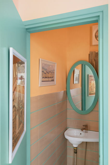 Memphis-inspired color and form language is balanced with openness so the space doesn’t feel busy or cramped.